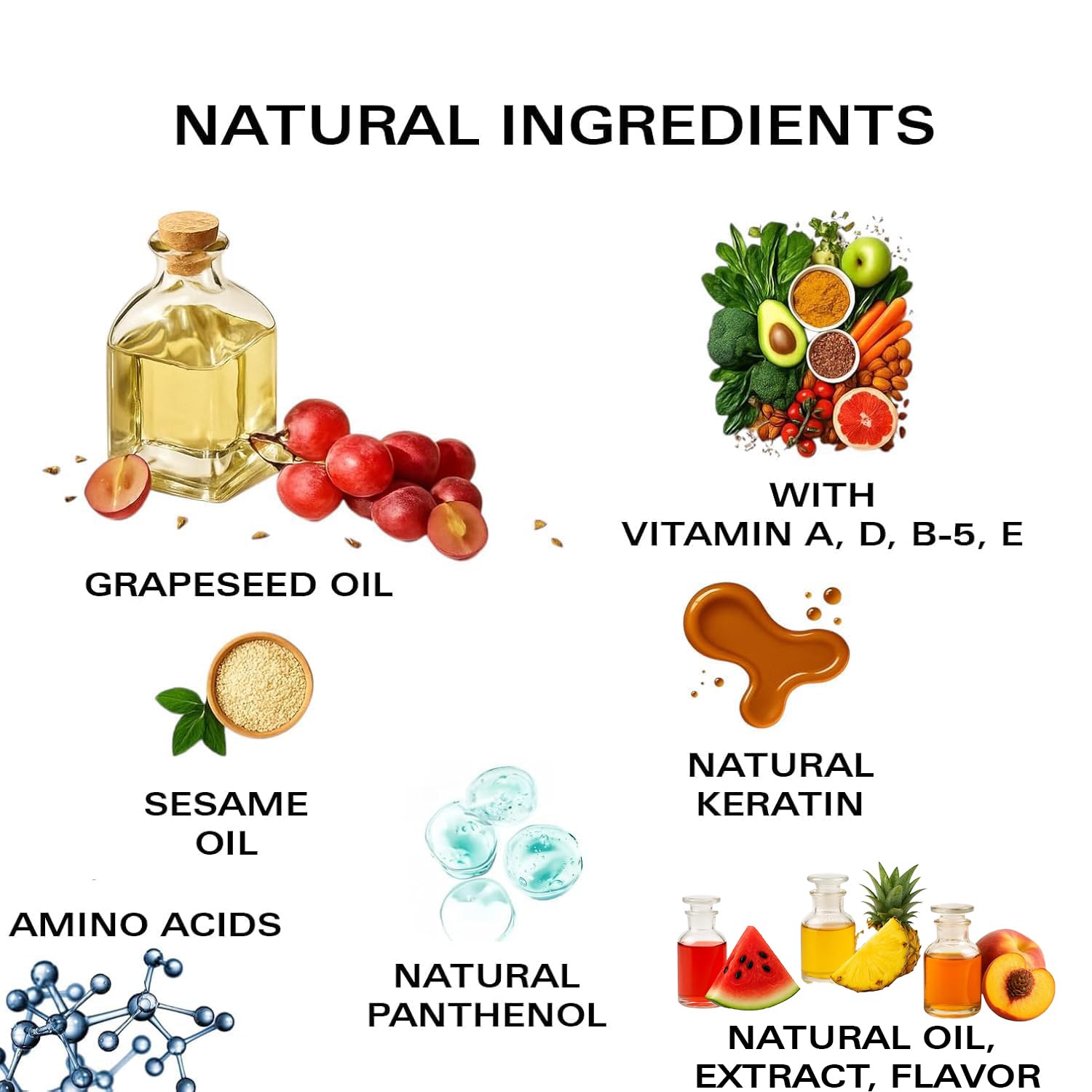 Ingredients: Grapeseed Oil, Amino Acids, Natural Keratin, Organic Calcium, Safflower Oil, Vitamin A, Vitamin D, Sesame Oil, Vitamin B-5, Vitamin E, Natural Panthenol, Thymol, Methyl Glucose Ether, Watermelon Natural Flavor, Pineapple Extract, Peach Extract