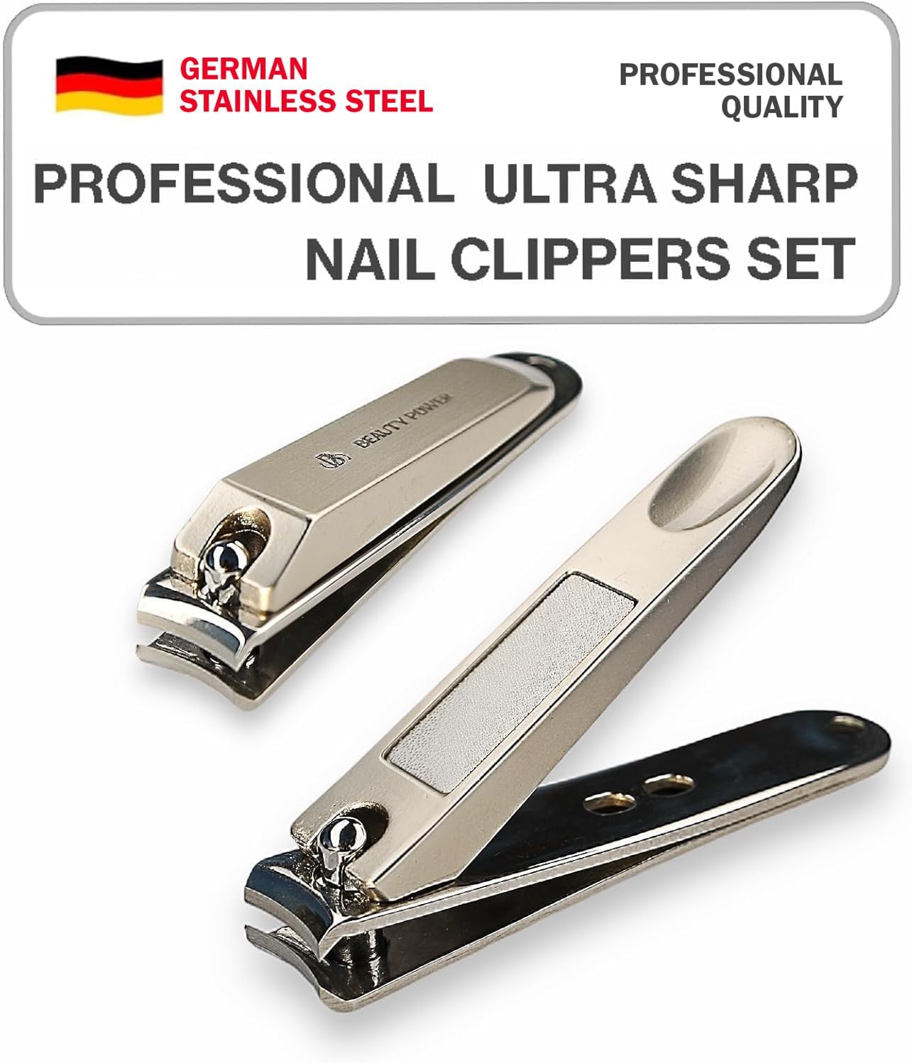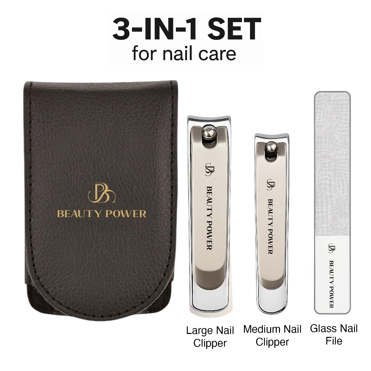 This review is for the Amazon product: Nail Clippers Set 3 in 1 - Stainless Steel Toe Nail Clippers, Fingernail Clipper, Glass Nail File, Anti Splash, Ergonomic Grip in PU Leather Travel Case for Men & Women (Black Case)This is a high quality nail clipper set featuring a glass nail file, a smaller finger nail clipper and a larger toe nail clipper. On the toe nail clipper, there is a reservoir to collect toe nail clippings that can easily be impeded out after use, which is nice for preventing nail clippings from going everywhere. These clippers cut my nails nicely and with ease, and feature a mini nail file on the inside of the clippers if I don’t want to use the included glass file. All three pieces can be stored with the included leatherette travel case. The interior of the case has three elastic loops to help secure the three pieces in the pocket, and the case is then secured with a snap on the front.I would highly recommend this Beauty Power Nail Clippers set because it is made out of quality materials, and offers a lot of added extras like the clipping reservoir on the toe nail clipper, and the metal file on the inside of both nail clippers.