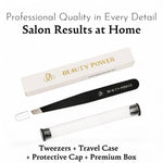 Stainless steel tweezers with 'Beauty Power' branding on a metallic surface