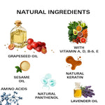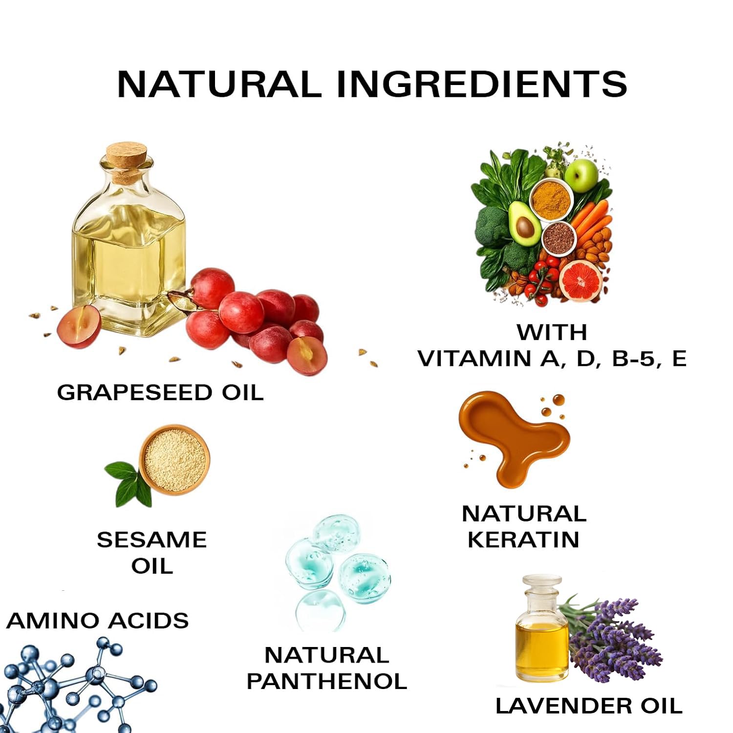 Ingredients: Grapeseed Oil, Amino Acids, Natural Keratin, Organic Calcium, Safflower Oil, Vitamin A, Vitamin D, Sesame Oil, Vitamin B-5, Vitamin E, Natural Panthenol, Thymol, Methyl Glucose Ether, Lavender Essential Oil