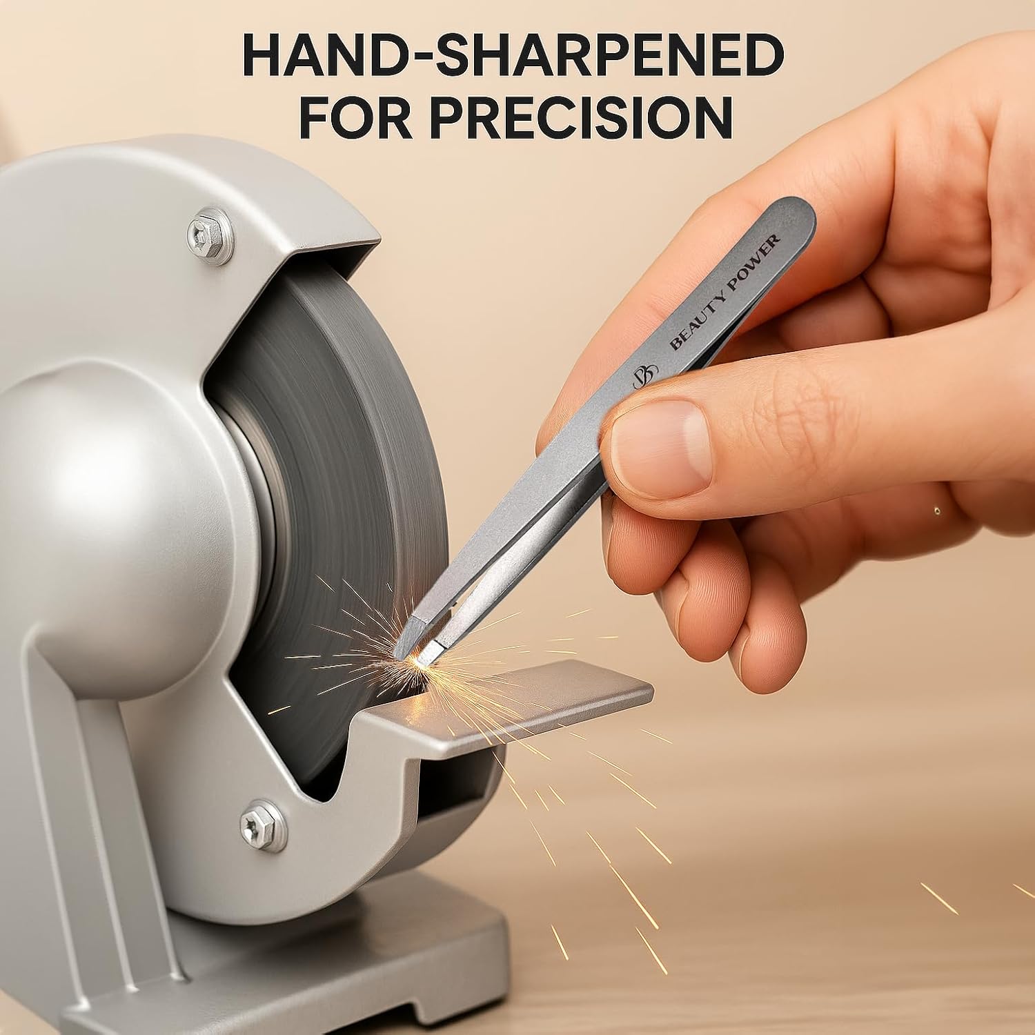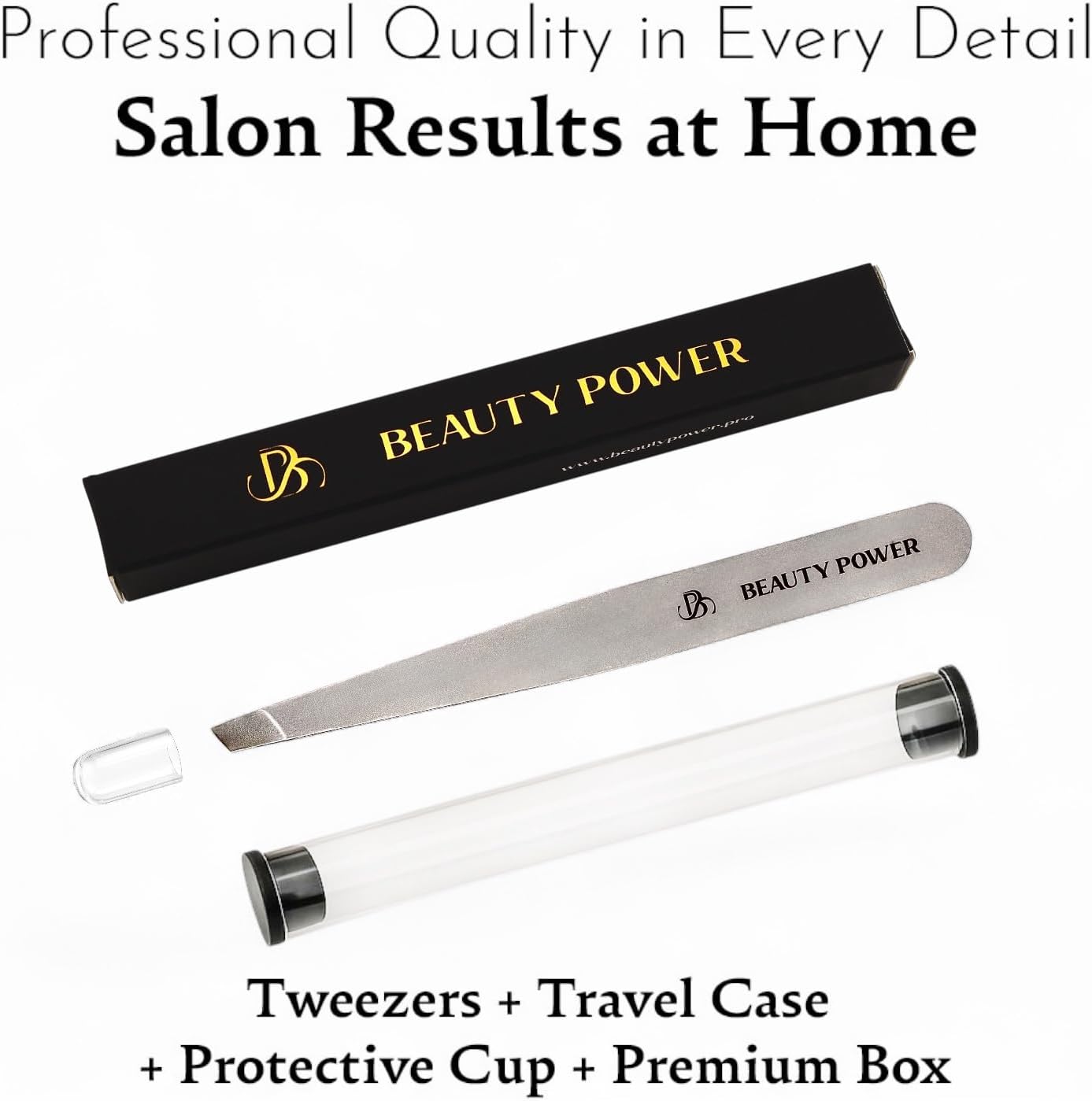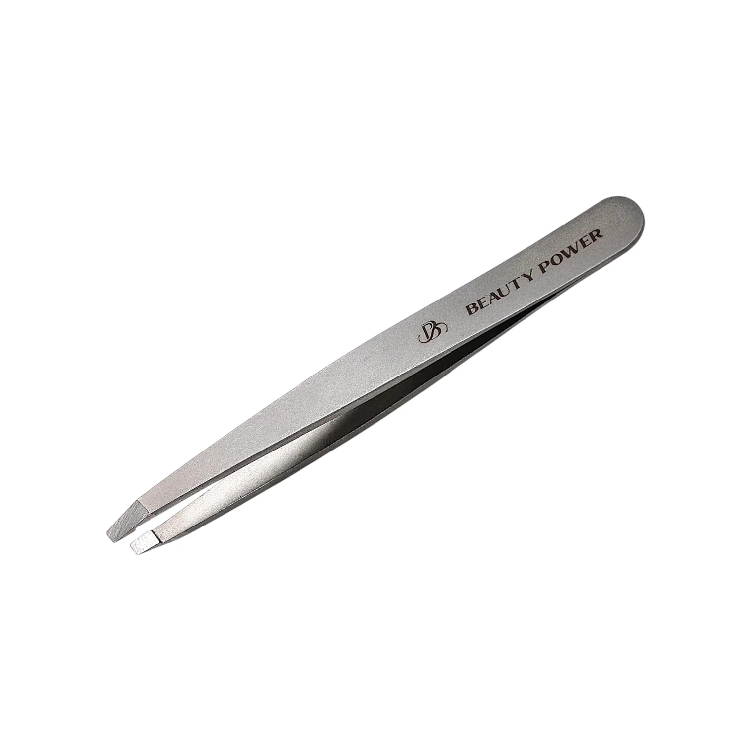 Stainless steel tweezers with 'Beauty Power' branding on a metallic surface